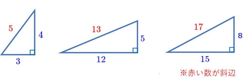 整数だけで,三平方が成り立つ(直角三角形の辺の長さが,すべて整数になる)組を「ピタゴラス数」という。無数に存在するが、この3つは出てくることが多い。(赤い数字は斜辺)